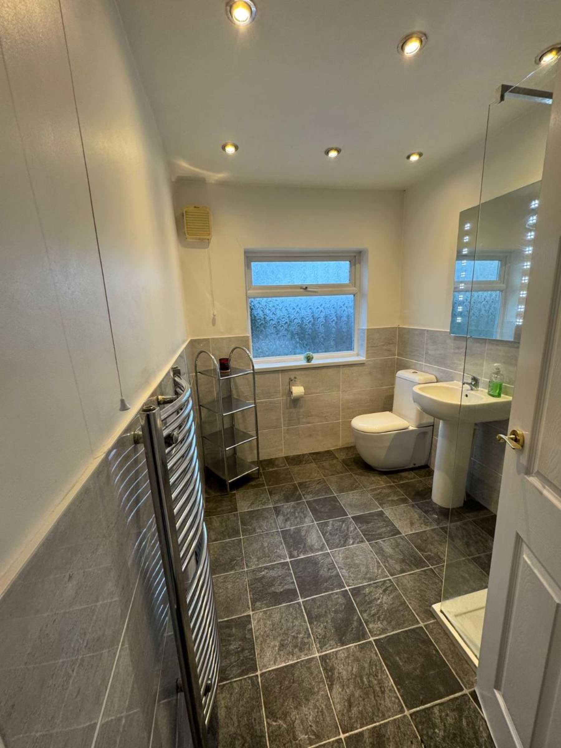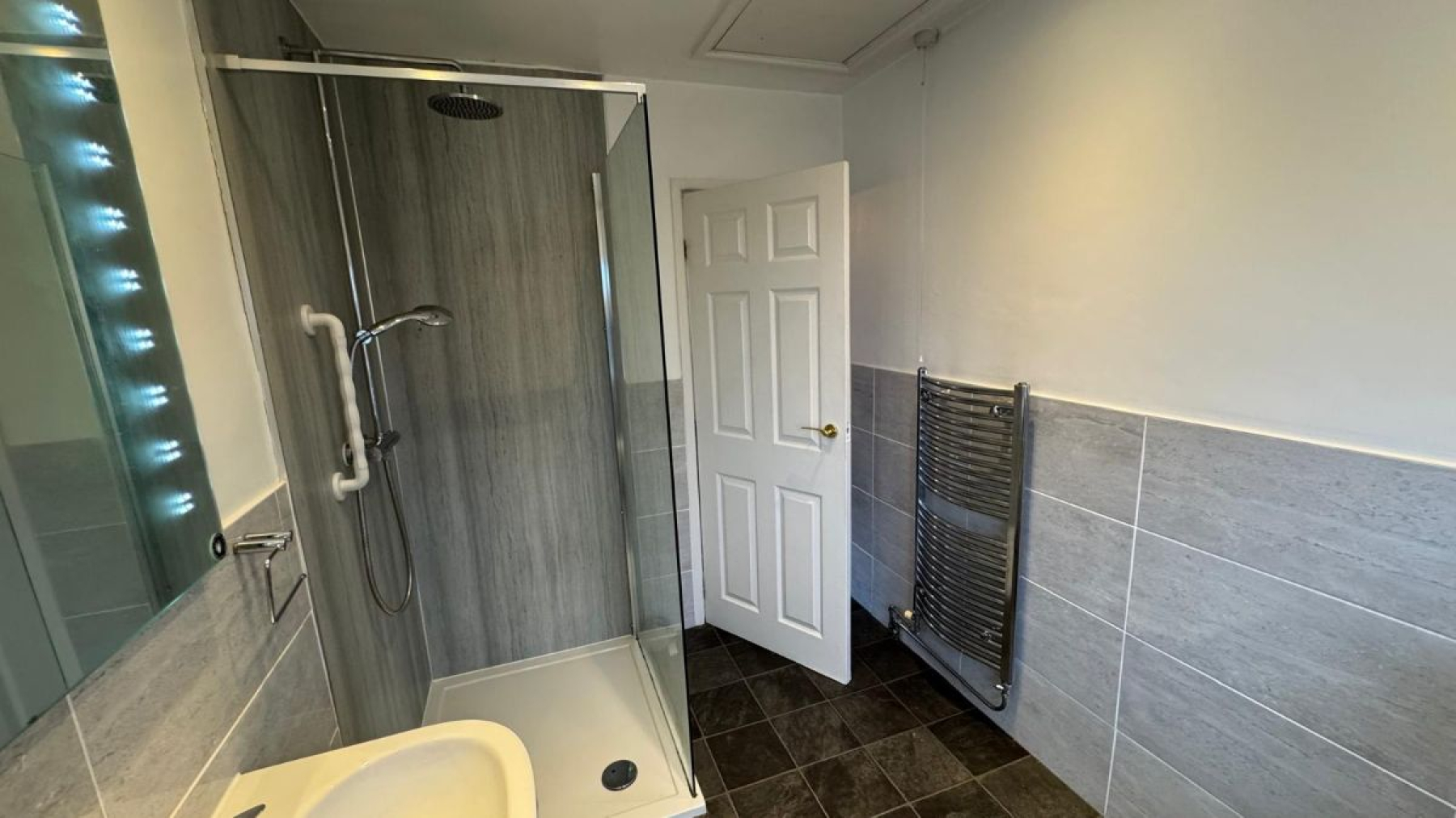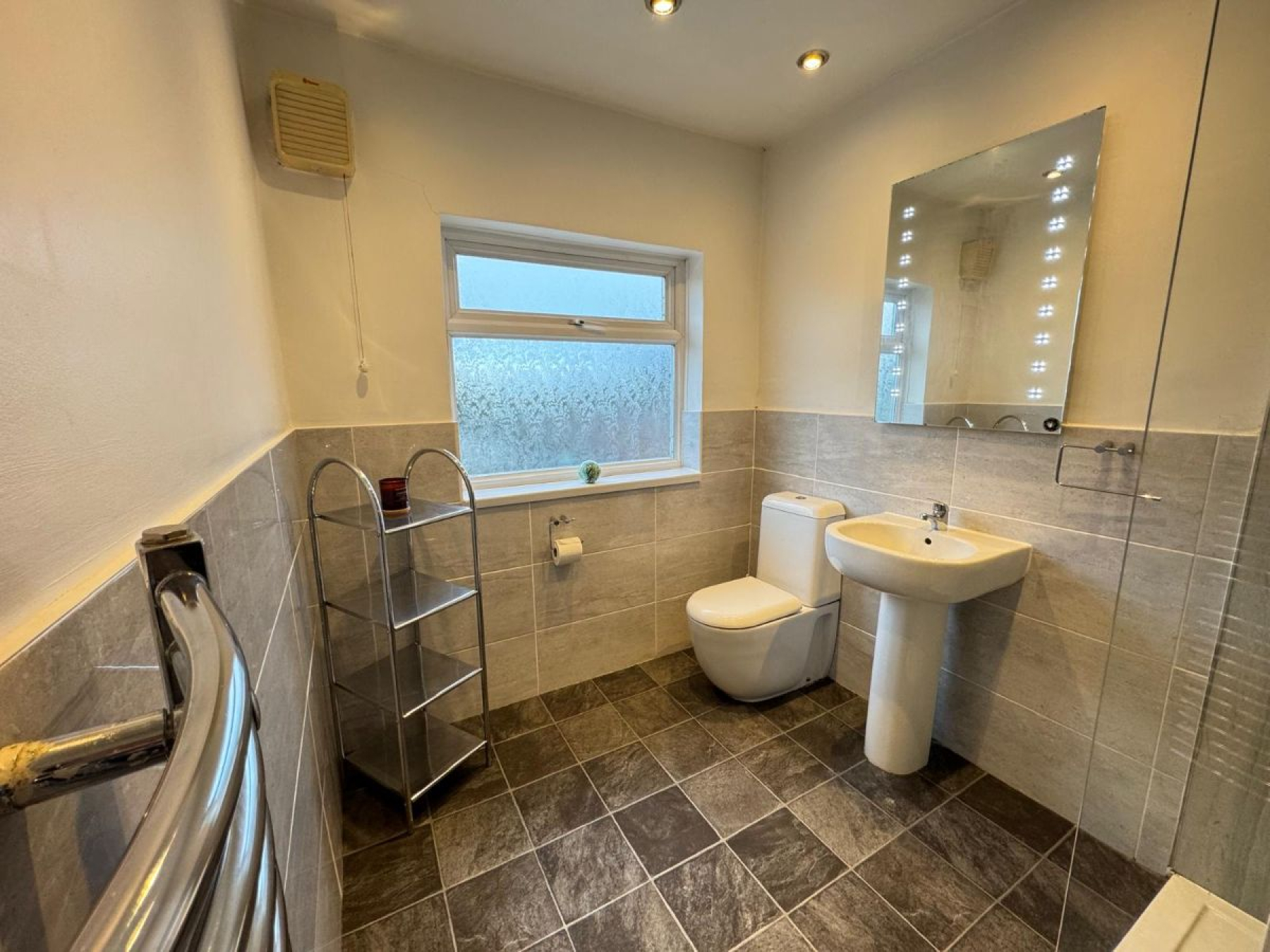 Modern tiled bathroom comprising: WC, large shower and sink with illuminated mirror.
