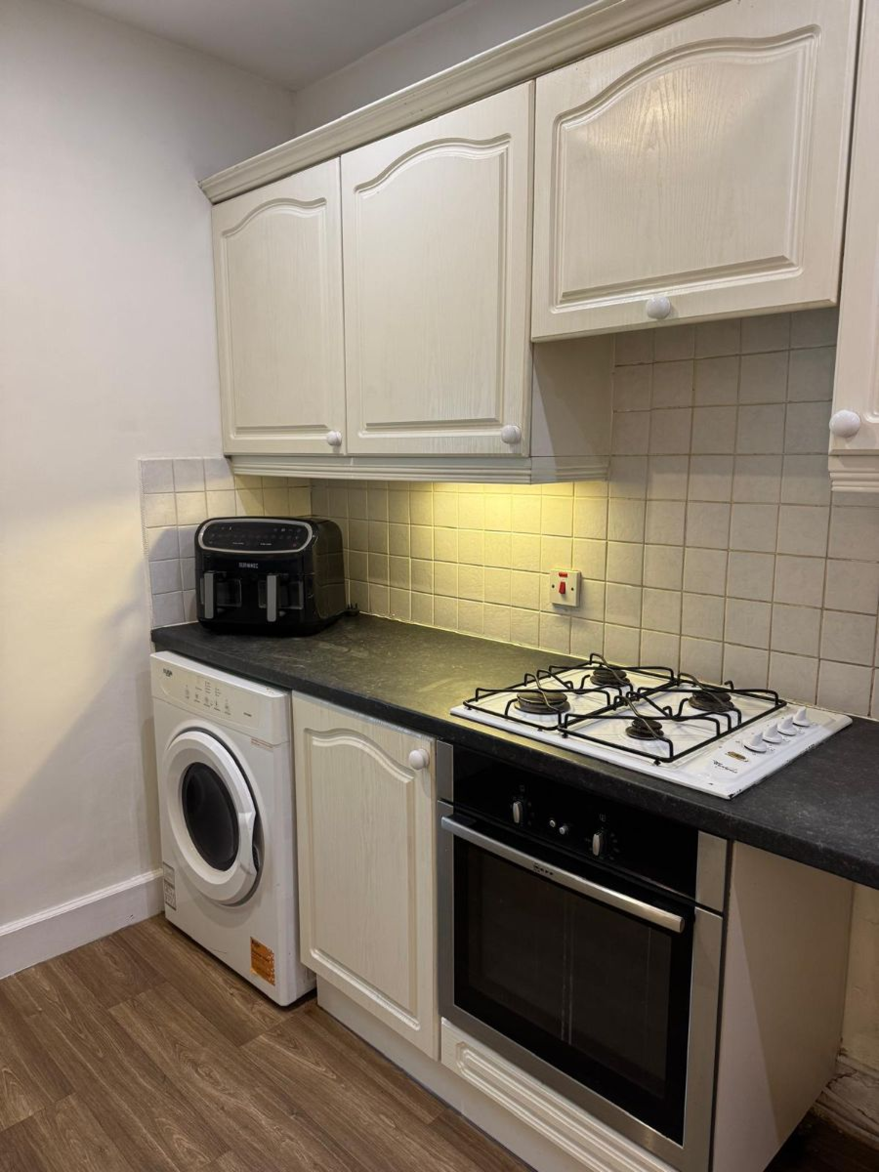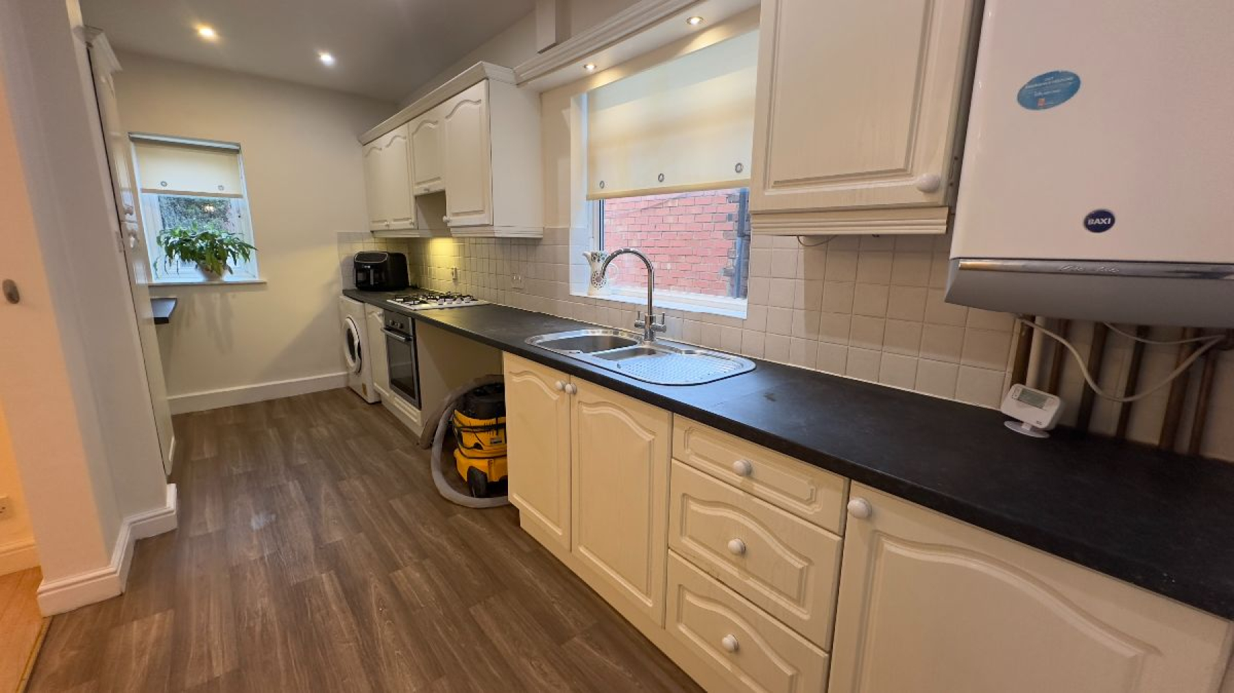 The kitchen has fitted base units and integrated oven and hob (gas). There is plenty of space and plumbing for a washing machine, dishwasher and side by side fridge freezer. There is ample work top and high level cupboards. The boiler is sited in this room.
