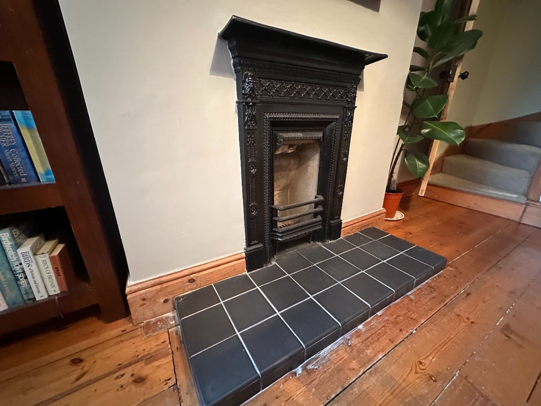 The main bedroom is located to the left of the staircase and overlooks the front street. It features a cast iron fireplace with original hearth tiling, another distinctive period feature. The room comfortably accommodates a double bed, wardrobe, dresser, and bedside tables, making it a peaceful and welcoming retreat. Picture rails continue here, offering flexibility for decoration.