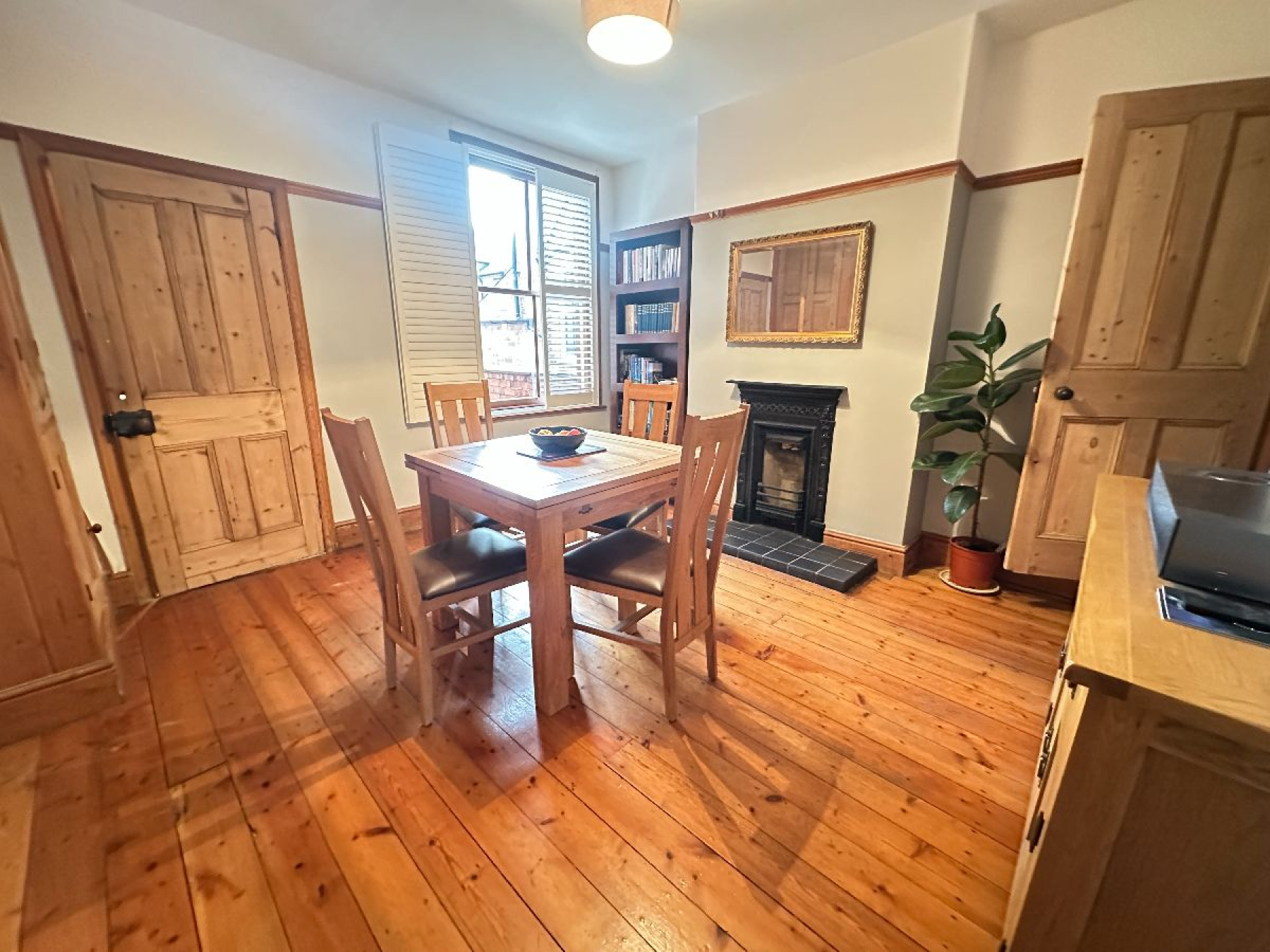 The dining room features a wonderful original iron fireplace and rim locks that are original to the doors. The single-glazed sash windows include adjustable shutters, allowing the room to feel bright and elegant while still offering privacy from the outside world. An original built-in storage cabinet provides a beautiful and practical solution for keeping belongings neatly tucked away.
