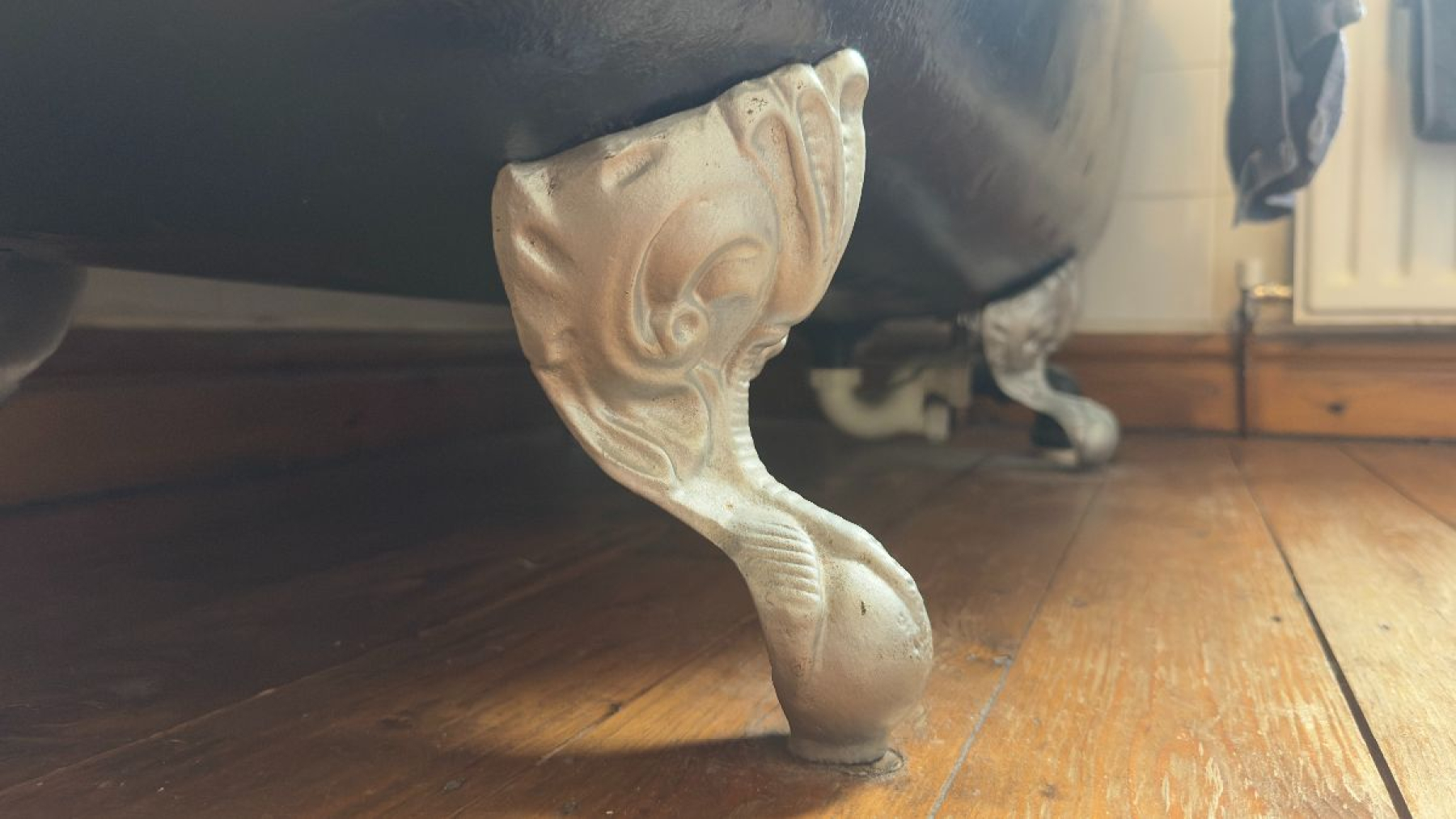 At the end of the hallway is the bathroom, fitted with a full four-piece suite. The original hardwood flooring continues into this space, adding warmth and texture. The bath and taps are powered by a Baxi combi boiler, ensuring modern comfort while maintaining period aesthetics. A standout feature is the blue-and-white roll-top, clawfoot cast iron bath, which adds a sense of everyday luxury.