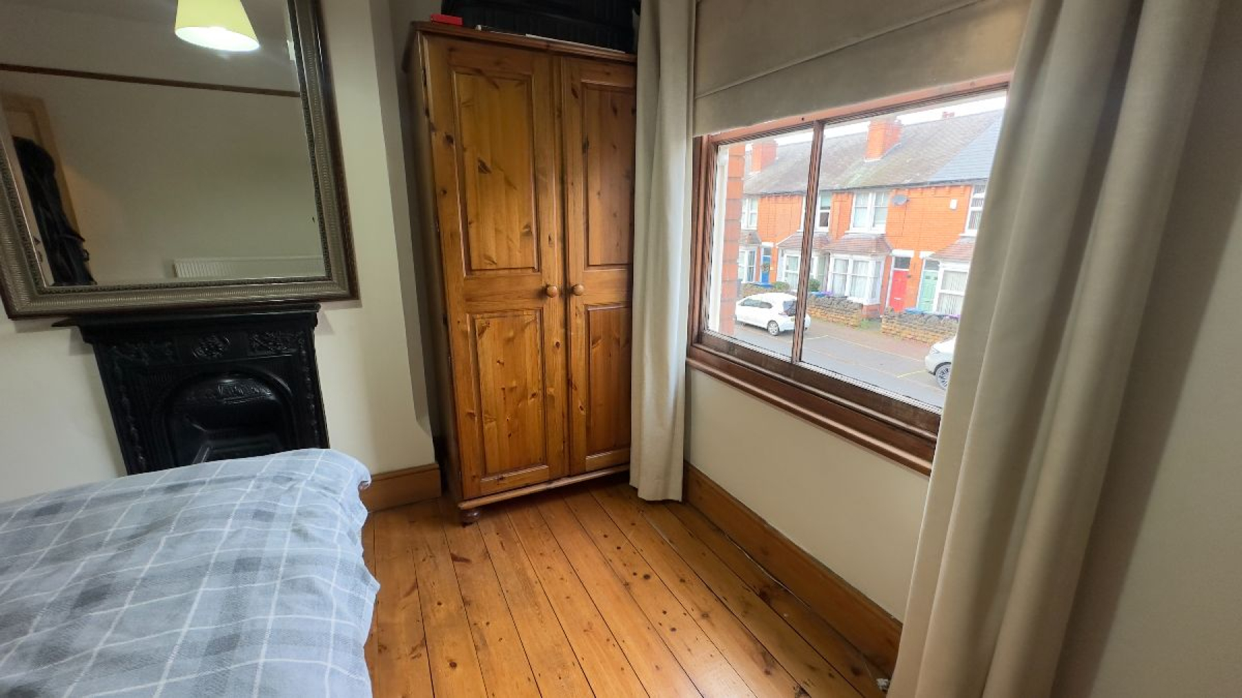 The main bedroom is located to the left of the staircase and overlooks the front street. It features a cast iron fireplace with original hearth tiling, another distinctive period feature. The room comfortably accommodates a double bed, wardrobe, dresser, and bedside tables, making it a peaceful and welcoming retreat. Picture rails continue here, offering flexibility for decoration.