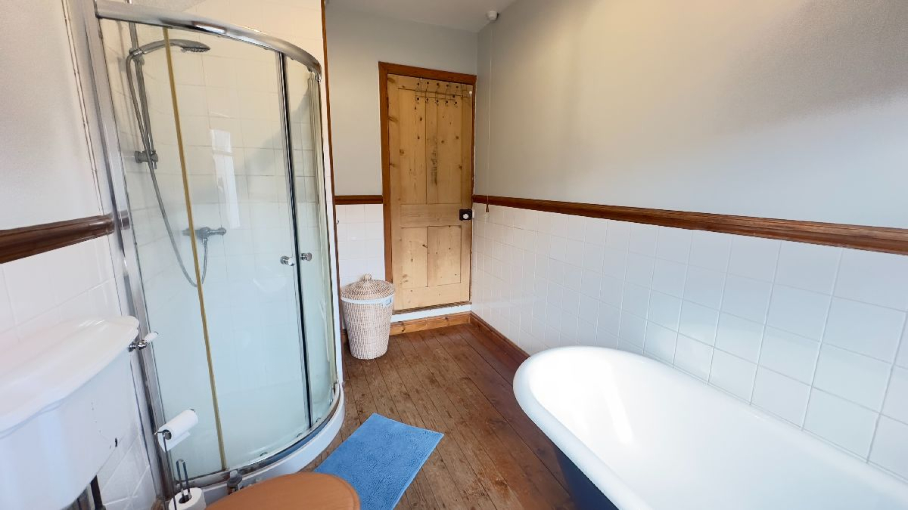 At the end of the hallway is the bathroom, fitted with a full four-piece suite. The original hardwood flooring continues into this space, adding warmth and texture. The bath and taps are powered by a Baxi combi boiler, ensuring modern comfort while maintaining period aesthetics. A standout feature is the blue-and-white roll-top, clawfoot cast iron bath, which adds a sense of everyday luxury.