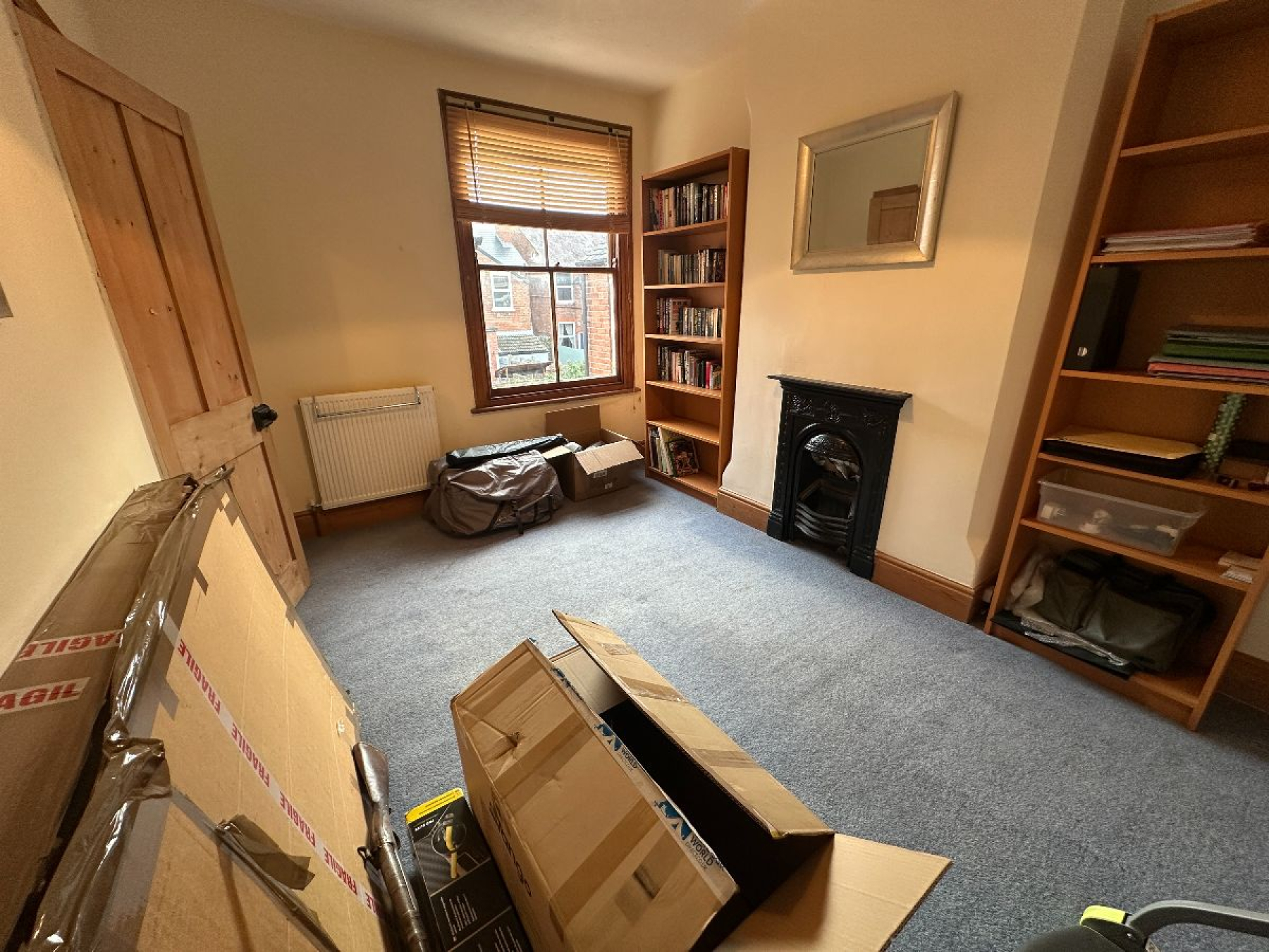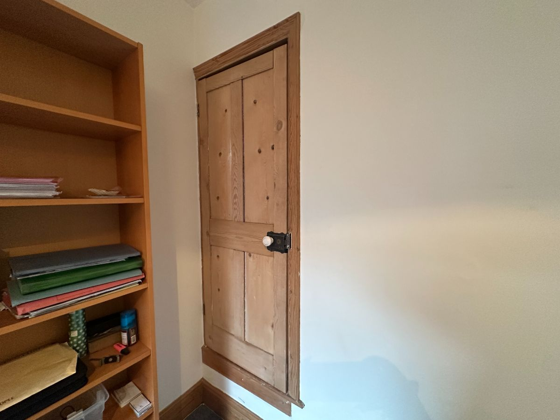 The second bedroom is positioned at the rear of the property, with a large sash window providing plenty of natural light and views over the garden. This room offers a quiet and restful atmosphere. The original rim lock shows signs of its history, adding character for those who appreciate antique details. The built-in storage cupboard also retains its original rim lock and shelving.