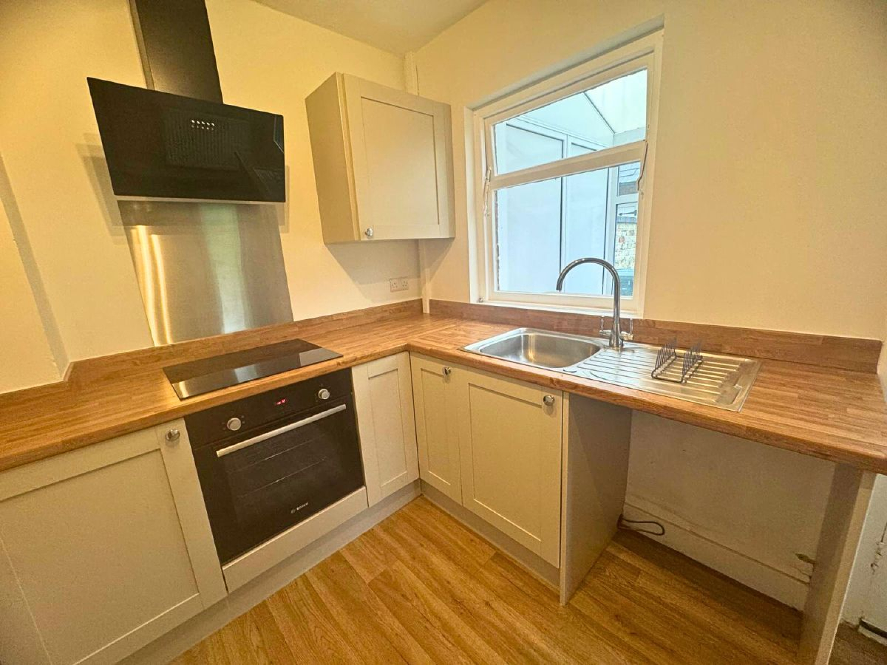 From the lounge, enter through the farmhouse sliding door leads the kitchen. The electric hob, inbuilt electric oven and extractor fan brings modernity to the cottage. With neutral cupboards, this is the ideal space for cooking, baking, crafting and even a cheeky take-away.