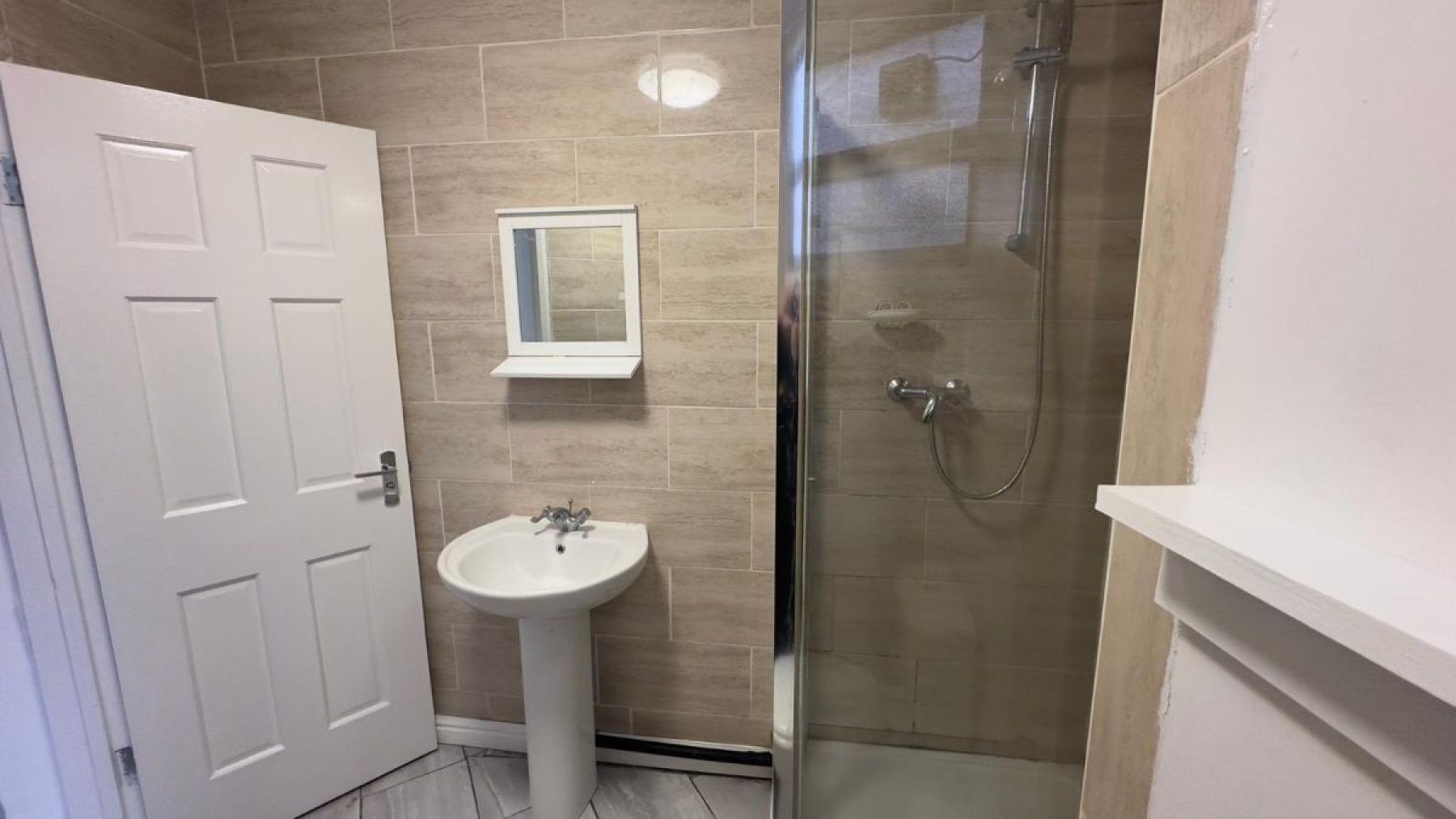 A modern shower room finished with neutral wall tiles and contemporary fittings. It features a glass-enclosed shower, WC, and wash basin with mirror, along with a window for natural light and ventilation, giving the space a fresh and practical feel.