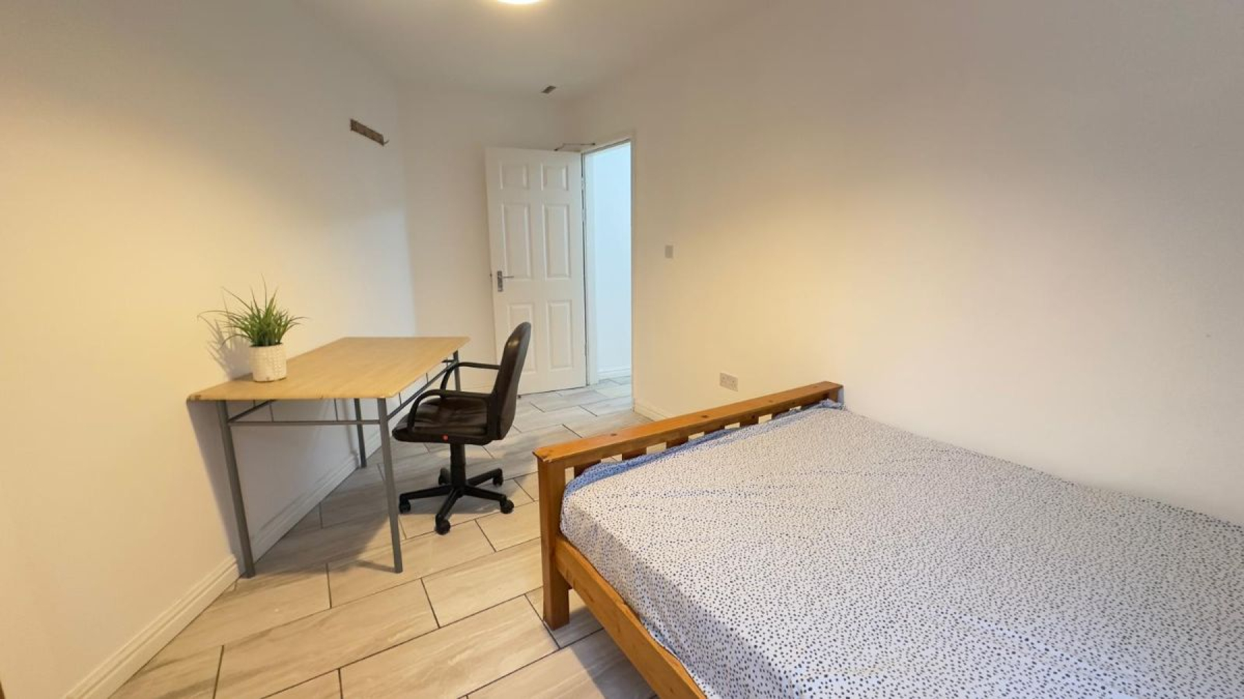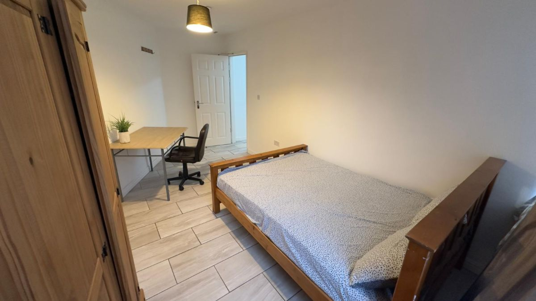 Double bedroom with large windows, perfect for watching the world go by. Includes a double bed, wide wooden wardrobe, desk and desk chair.