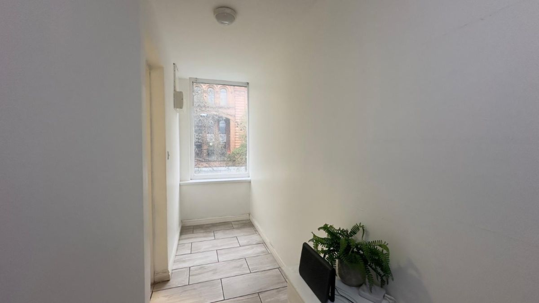 A bright, freshly finished hallway with white walls and modern tiled flooring, creating a clean and welcoming entrance. Natural light flows in from the window at the left, and the space provides direct access to the shower room.